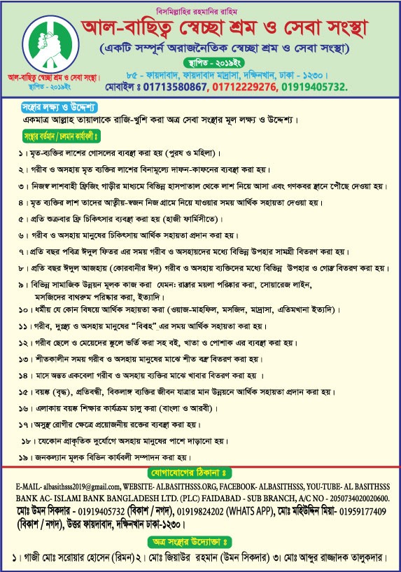 About Usক) অত্র সংস্থার সংগৃহীত অর্থ “আল-বাছিত্ব সে¦চ্ছা শ্রম ও সেবা সংস্থা”র নামীয় ইসলামী ব্যাংকের (ফায়দাবাদ শাখা) সঞ্চয়ী হিসাবে ব্যাংক একাউন্টে জমা করা হয়। খ) সভাপতি, সাধারন সম্পাদক ও অর্থ সম্পাদকের যৌথ স্বাক্ষরে ব্যাংক একাউন্ট পরিচালিত হয়।